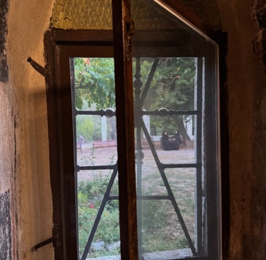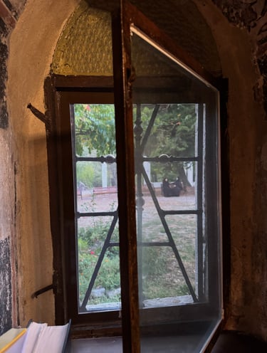 ... von einem Holzfenster in der Kirche hinter dem Gesangspult. Das vorhandene alte Eisenfenster lässt Kälte und Feuchtigkeit durch, was zu häufigen Erkältungen bei den Schwestern führt.