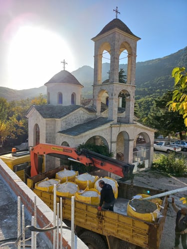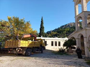 Ich wusste: Hilfe tut Not. Und ich werde helfen. Mitte November 2011 kam ich wieder. Da war der kleine Verein gegründet, um Spenden zu sammeln, dem Kloster zu helfen. Diesmal kam ich mit dem Auto, fuhr durch die kalte, regennasse Berglandschaft, die Scheiben beschlugen, die Heizung im Auto lief. Und wurde wieder herzlich aufgenommen. Manches hatte sich schon verändert. Ein moderner Ofen wärmte die klamme Kirche, bescheidene Fortschritte waren zu sehen. Aber es war kalt und nass. Auch im Haus – Herbstwinde fauchten, es goss, und bald hatte ich das Gefühl, dass alles feucht würde, das Zimmer, die Bettdecke, die Kleidung, und nicht mehr trocknen könne. Irgendwann setzte ich mich ins Auto und fuhr ins Dorf, um warm und trocken zu werden, und dann in die nächste Stadt, und kehrte, durchgewärmt, zurück. Nachhaltig war das nicht und eine gute Lehre: Mit Gottes Hilfe so viel Mittel zu sammeln und Menschen zu begeistern, dass die Vision von dem wiederbelebten Kloster Agios Georgiou Karaiskaki beginnen kann, Wirklichkeit zu werden. Staunend darf ich nun miterleben, welche Blüten da nun blühen. Wie geholfen wird. Welche Wege Gott für diese Hilfe möglich macht: die materielle Lage – Wärme, Licht, Selbstversorgung, Klosterarbeit und so weiter – bietet mehr und mehr jenen gesicherten Boden, der die Konzentration auf das geistliche Leben dort oben in den kargen Bergen erleichtert, ohne das die bestechende Einfachheit des klösterlichen Lebens daran Schaden nehmen würde. Dafür, für dieses Geschenk, bin ich überaus dankbar.“